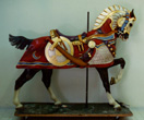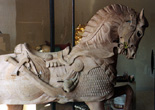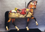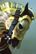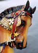 The chamfron, or head covering, has gold leaf scrollwork over white gold. Historically, armor was often filigreed in this manner.