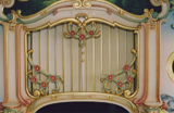 The center of the band organ facade, showing the Wurlitzer logo, also has swell shutters, that help to modulate the volume of the music.