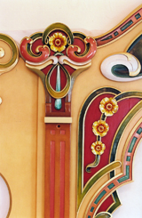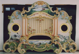 This re-created Wurlitzer 165 facade was carved by Bob Yorburg. The illustrations were designed and painted by Marguerite Juner from the client's own photographs. Pam Hessey designed the colour, leaf and paint on the raised carved areas surrounding the illustrations.