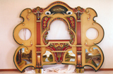 Here are two side panels; the original, de-laminated one, and the recreated new one, with the carvings from the original moved to it and painted in original colours.
