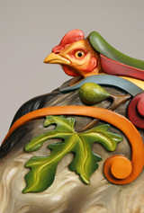 The chicken peers warily from under the saddle cantle, framed by a fig and leaf design.