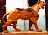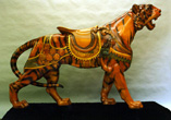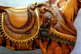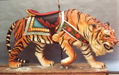 Transparent oil glazes were utilized directly over the sealed wood surface. There were some dark heartwood areas that needed overpainting and woodgraining to bring them to the same tone as the rest of the tiger.